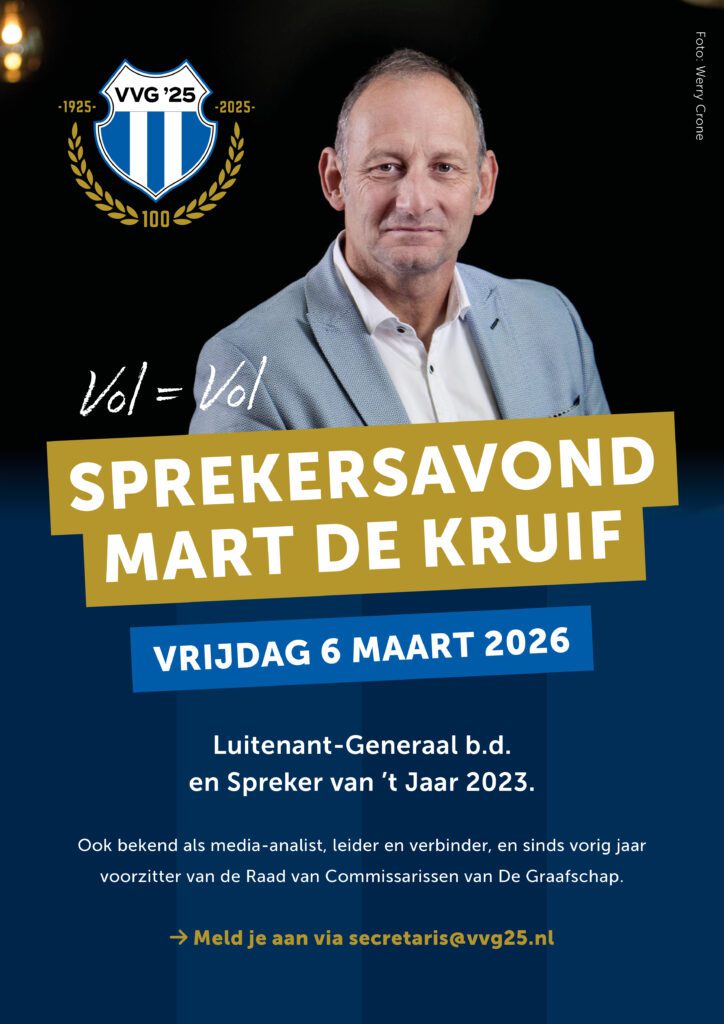 Op vrijdagavond 6 maart organiseert VVG ’25 een bijzondere sprekersavond in de kantine. Met deze avond sluiten we het 100-jarig jubileum van onze vereniging op passende wijze af. Te gast is Mart de Kruif, Luitenant Generaal b.d. van de Koninklijke Landmacht en uitgeroepen tot Spreker van ’t Jaar 2023.