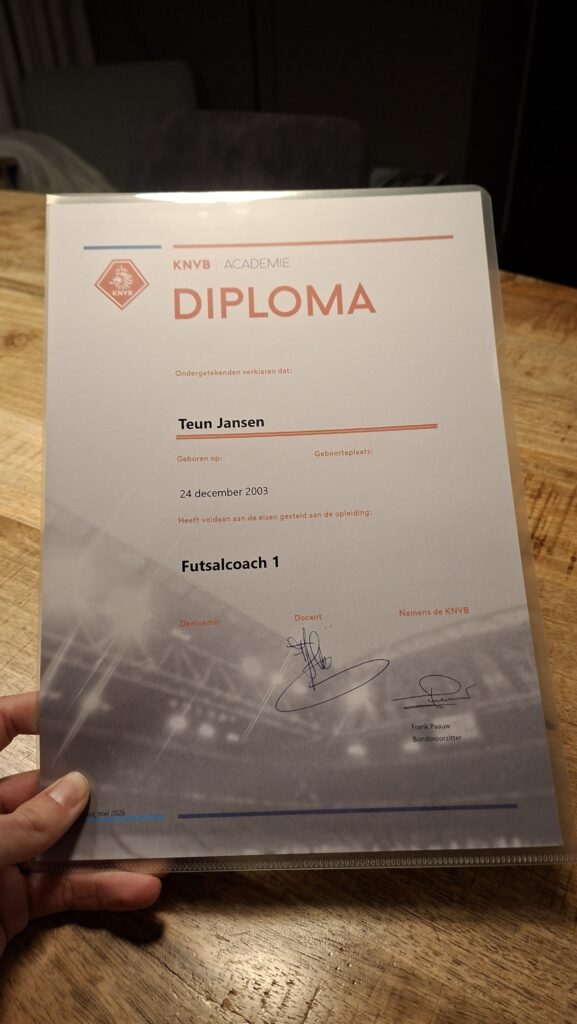 Teun Jansen heeft zich hiervoor kandidaat gesteld en hij heeft hier de laatste maanden veel tijd in geïnvesteerd. Op 13 april 2026 heeft Teun met succes het diploma Futsalcoach 1 behaald.